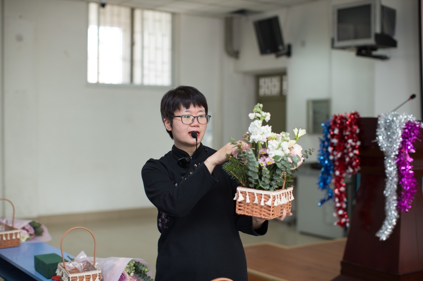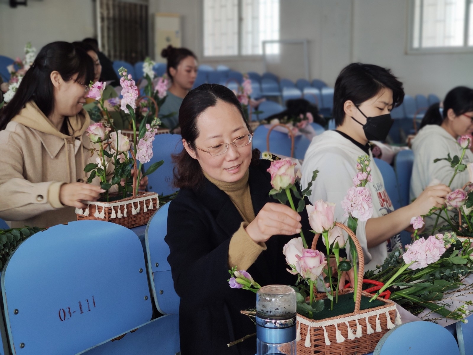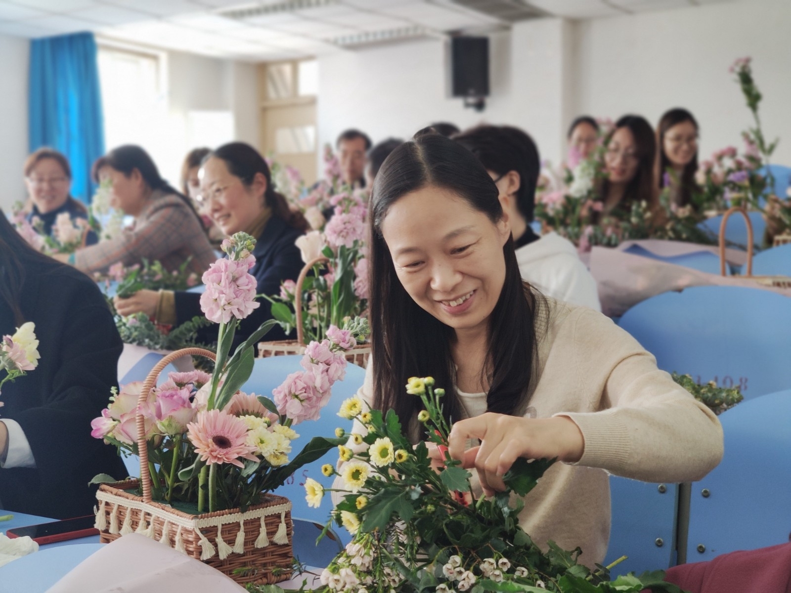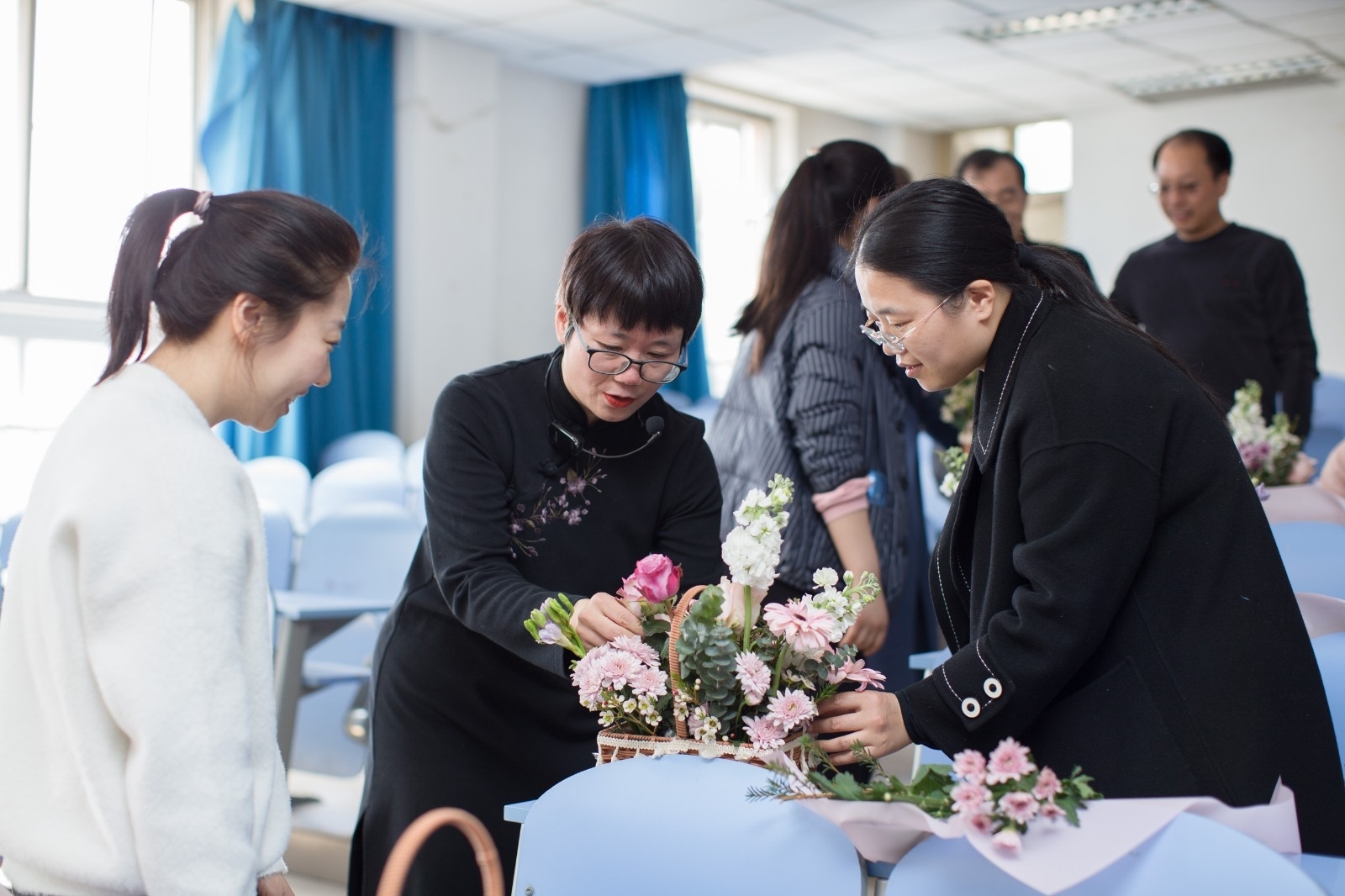下午,一阶三教室一片喜庆,洋溢着节日气氛,学院盛邀生命科学学院田云芳老师向大家教授插花艺术,田老师的讲解生动细致,插花技艺精湛,从花材的品种、形态到插花艺术作品的构思与实践,无不深入浅出,意蕴无穷。老师们兴致勃勃、认真构思,一支支花材变成了一篮篮错落有致、造型各异的插花作品,现场氛围活泼温馨。