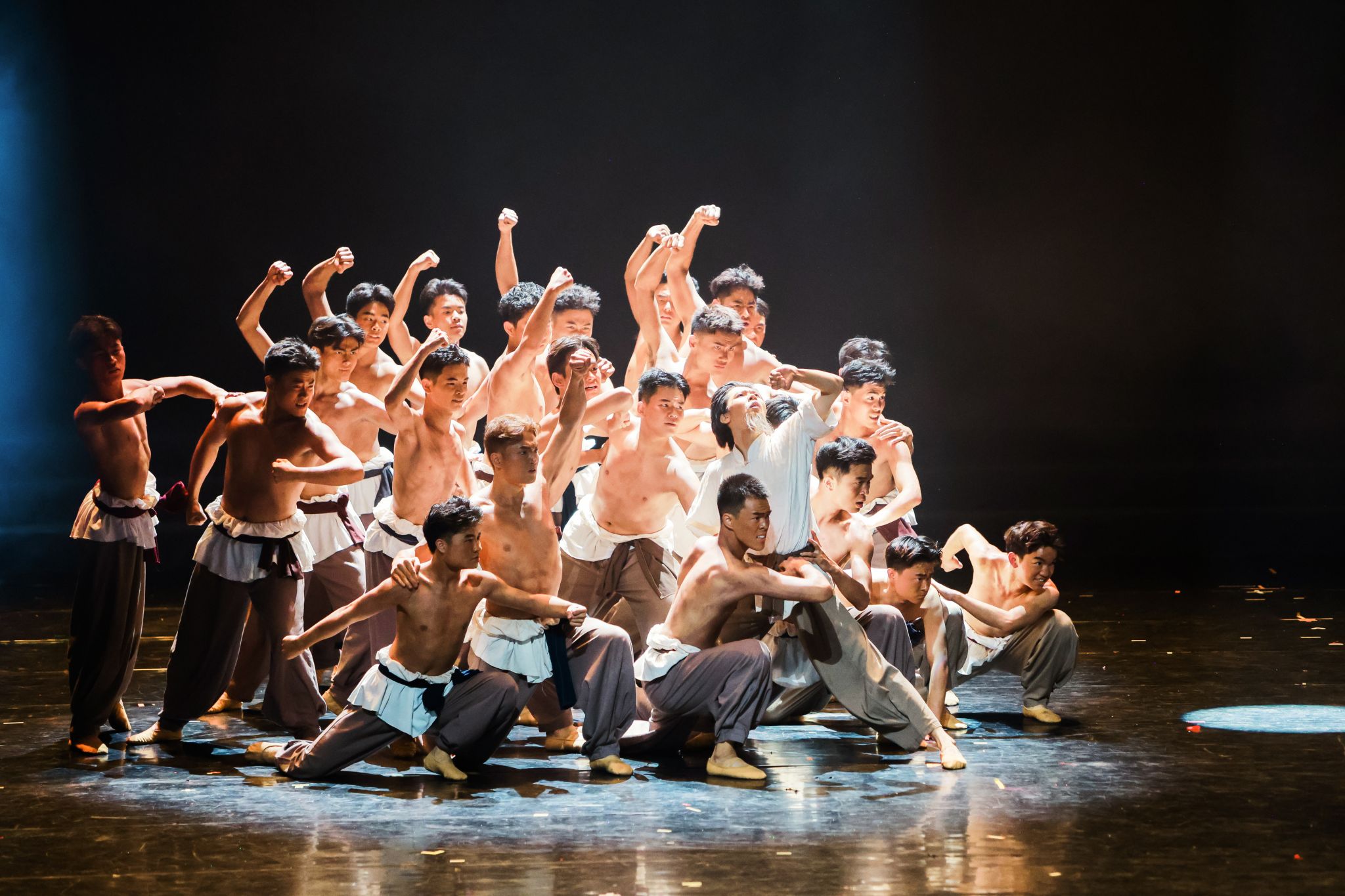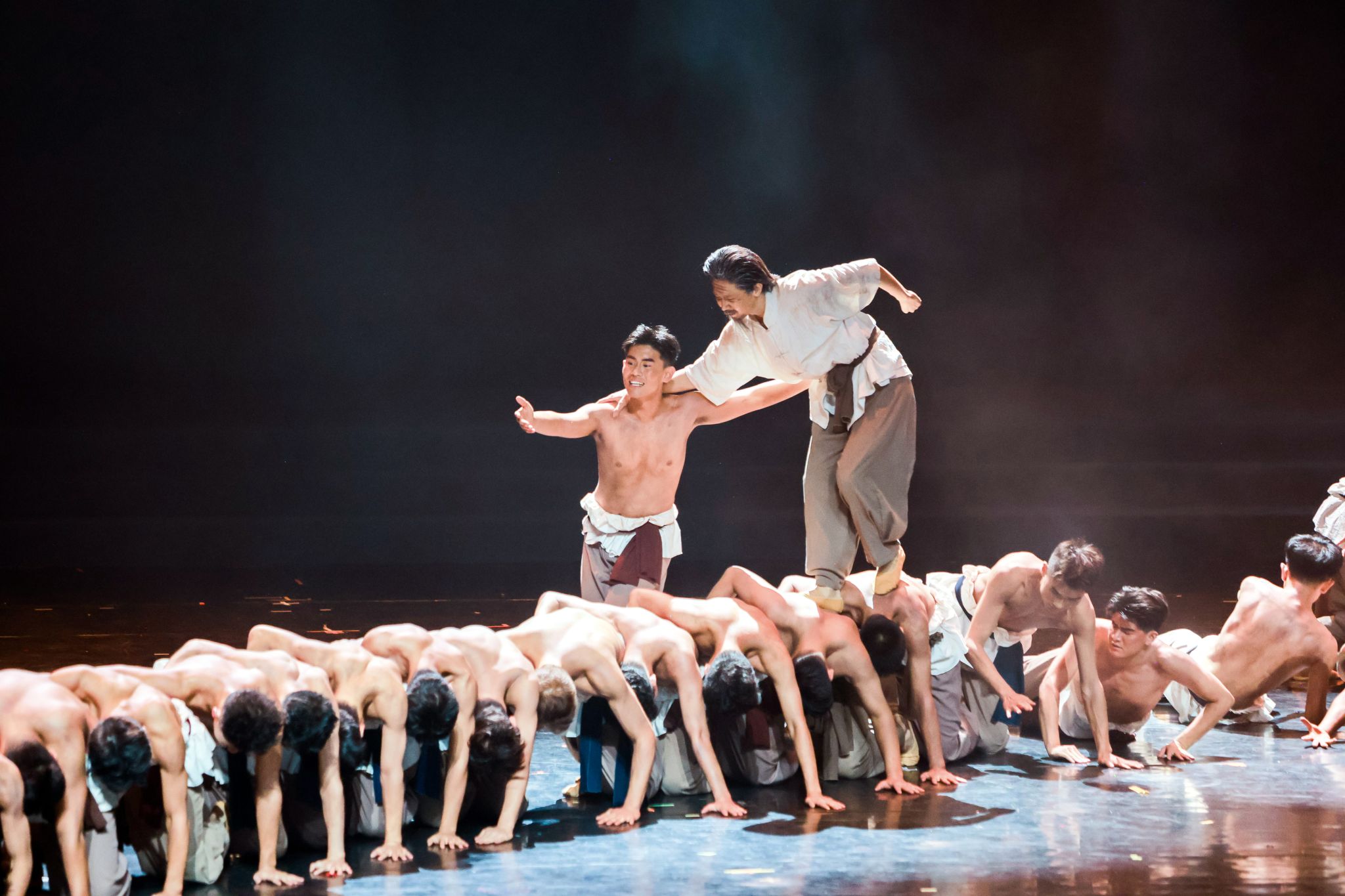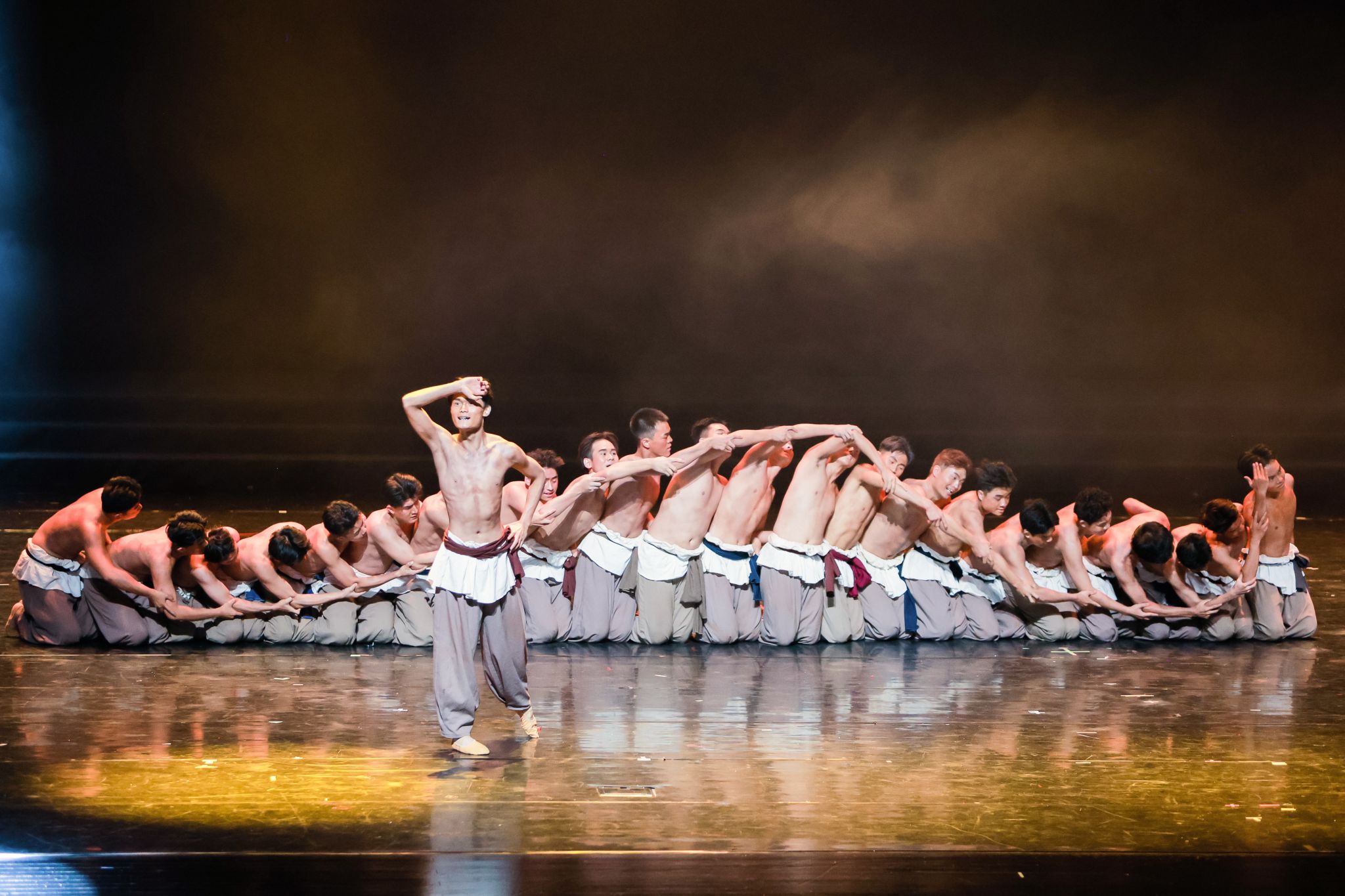舞蹈作品《母亲河流过我心上》演出团队共28人,舞蹈以黄河文化为叙事主线,聚焦黄河儿女守护家园的主题,通过极具张力的肢体语言和情感表达,跨越声音屏障,生动再现了黄河岸边的壮阔图景,展现了黄河奔腾不息的自然伟力与中华民族坚韧不拔的精神品格。舞台上,听障舞者们化身坚韧的治沙人,双臂挥动如风,将开垦荒漠、播撒绿色的艰辛展现得淋漓尽致。领舞饰演的老爷爷角色,以苍劲执拗的舞姿,演绎了代代相传、生生不息的愚公精神。而在展现希望与生机的段落,演员们以充满力量与美感的“双飞燕”等专业技巧腾跃而起,恰似破土新苗迎风招展,让生命的活力在黄土地上蓬勃迸发,将黄河的磅礴气势与沿岸人民的情感羁绊融为一体,谱写了一曲对黄河的深情礼赞。