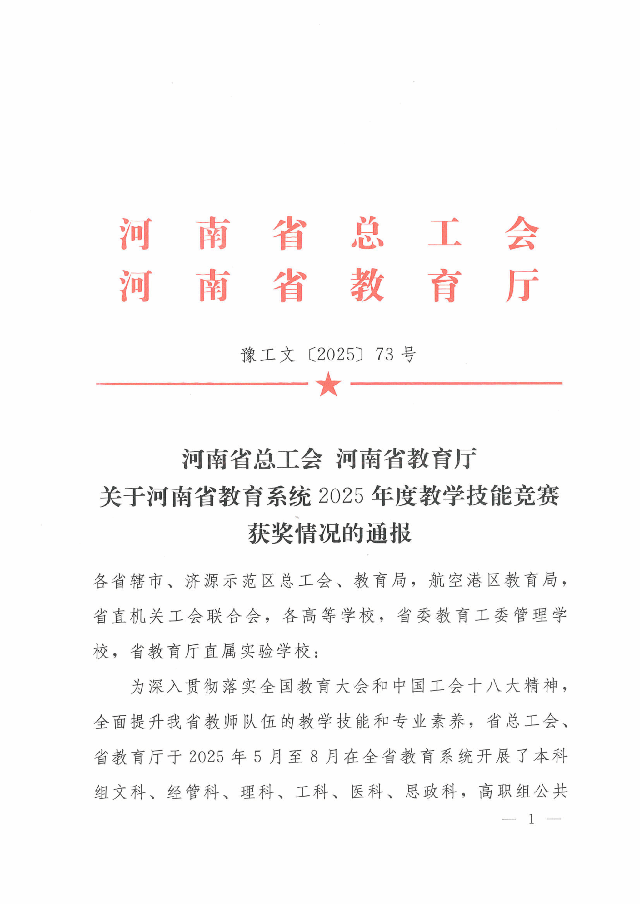 近日,河南省总工会、河南省教育厅联合印发《关于河南省教育系统2025年度教学技能竞赛获奖情况的通报》,表彰2025年度省级教学技能竞赛获奖人员。我校教师朱晨阳、李依获省级教学技能竞赛一等奖,闫晓杨、职露获省级教学技能竞赛二等奖,王洋获省级教学技能竞赛三等奖。